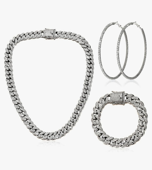 Cuban Link Chain Necklace Bracelet Rhinestone Earrings Bling Necklace Bracelet Crystal Big Circle Earring for Women